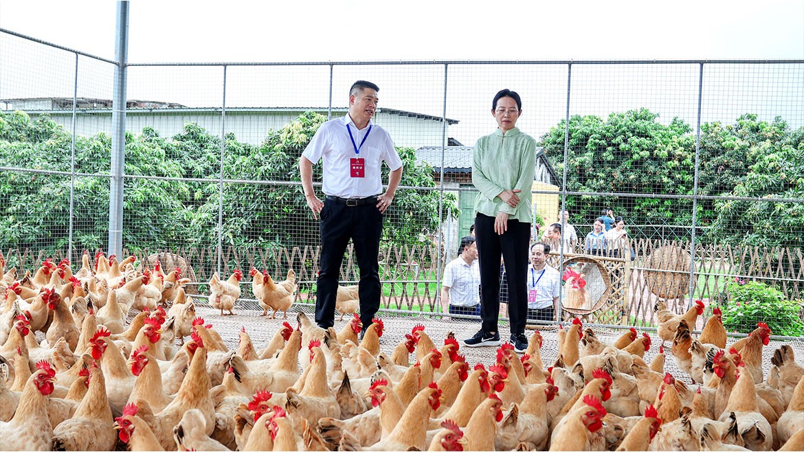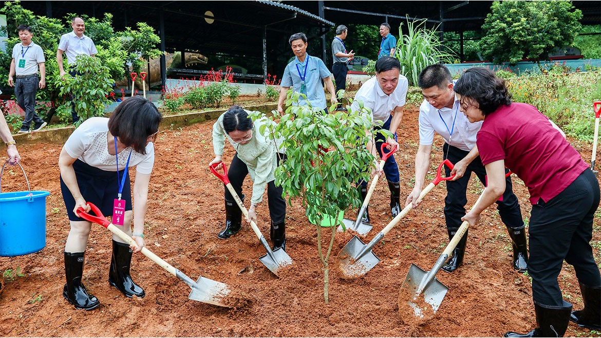 推介大會結束后,與會領導參加“綠美廣東”新品荔枝種植活動,種植早熟荔枝新品種“仙桃荔”,并參觀野生荔枝林,體驗廉江荔枝文化,還實地了解荔枝林下的湛江雞養殖情況。省農業農村廳領導、湛江市領導、湛江市直單位領導和廉江市領導參與“綠美廣東”新品荔枝種植活動。
